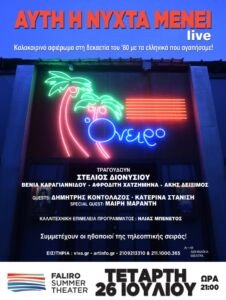 «Αυτή η νύχτα μένει-Live»! Μετά τη μεγάλη επιτυχία της πρώτης συναυλίας στο θέατρο Πέτρας, το μεγάλο πάρτι του καλοκαιριού συνεχίζεται, αυτή τη φορά κοντά στη θάλασσα, στο Faliro Summer Theater, την Τετάρτη 26 Ιουλίου.