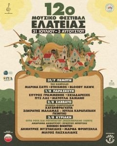 Ο Σύλλογος Νεολαίας Ελάτειας μας προσκαλεί στο 12ο Μουσικό Φεστιβάλ Ελάτειας, για να ζήσουμε όλοι μαζί μία μοναδική εμπειρία σε μια υπέροχη τοποθεσία μέσα στη φύση ανάμεσα σε πλατάνια, πεύκα και ρυάκια. Τα μεγαλύτερα ονόματα της ελληνικής έντεχνης και εναλλακτικής μουσικής θα είναι εδώ σε ένα τετραήμερο φεστιβάλ γεμάτο μουσική και ενέργεια!