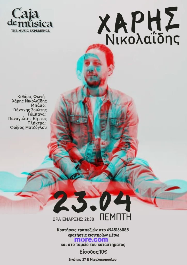 Ο τραγουδοποιός Χάρης Νικολαΐδης ανεβαίνει στη σκηνή του Caja de Musica την Πέμπτη 23 Απριλίου για μια ζωντανή εμφάνιση με τραγούδια από τον πρόσφατο δίσκο του «Χάρης, χάρηκα», αλλά και επιλογές από το μέχρι τώρα υλικό του.