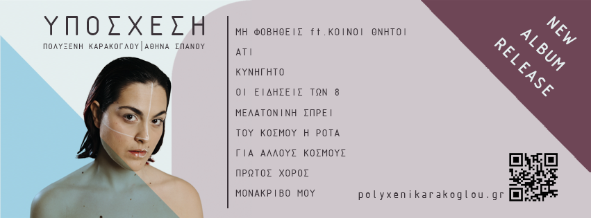 Η Πολυξένη Καράκογλου, η τραγουδοποιός με τον αιχμηρό λόγο και την ευαίσθητη γραφή μας παρουσιάζει το 4ο κατά σειρά προσωπικό της album με τίτλο «ΥΠΟΣΧΕΣΗ» σε μουσική δική της και στίχους δικούς της και της Αθηνάς Σπανού.